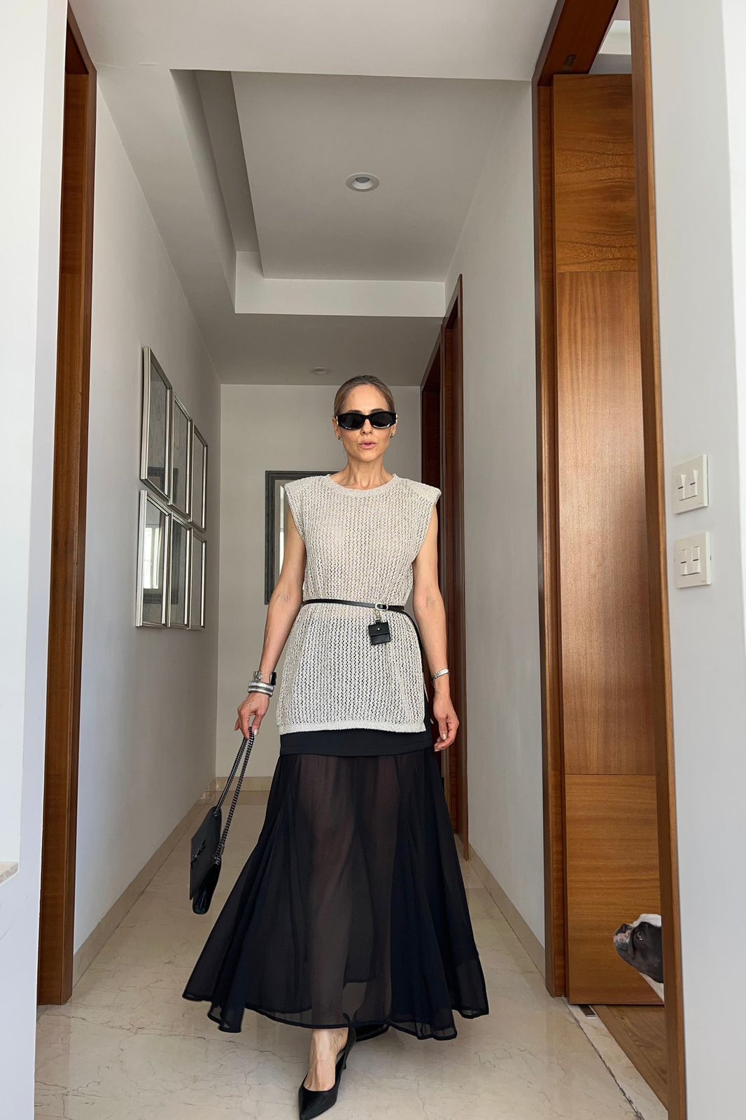 Blusa tejida color beige con cinto negro.